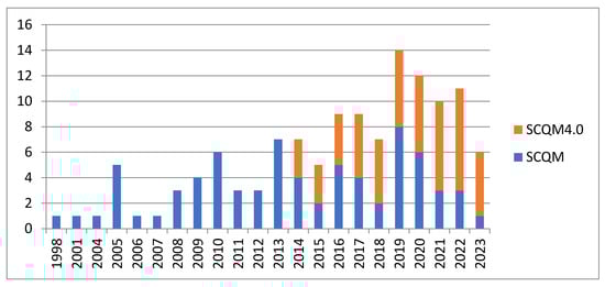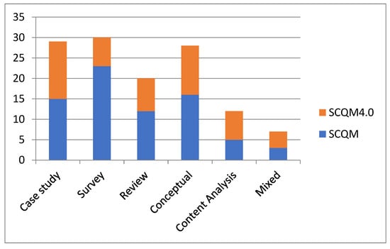 In conducting thematic analyses, primary searches focused on identified key relationships and pivotal areas of discussion, either proposed (for conceptual studies) or established (for empirical studies). These key aspects were carefully noted in each article within the category review (SCQM and SCQM 4.0). Subsequently, the essential elements of the topics are discerned, paving the way for systematic classification and coding. Ultimately, hardly any articles about SCQM 4.0 were found. Four research types were utilized in this study. Initially, the model type comprises the primary classification for each paper, drawing inspiration from the work of Sayama [29] for the classification of scientific models. After defining the model type, the SCQM (coordinated and/or integrated) goals are distinguished in the second category. The third category, “applied tools,” encompasses modeling tools or techniques employed in each research. Fourth, coordination/integration mechanisms include the necessary management practices.