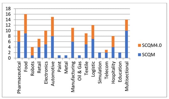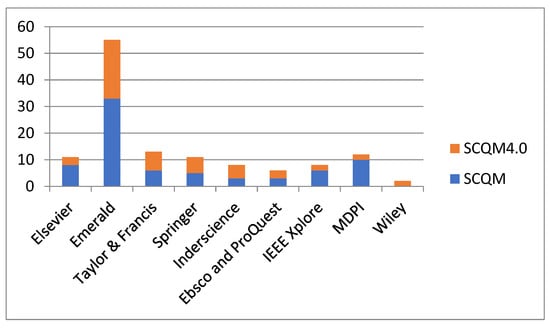 Figure 4 illustrates the number of papers/articles per database of the antecedent literature related to SCQM. Despite the variety of databases used in the search, the articles seem to be concentrated mainly on a few key databases, notably Emerald, Elsevier, and Taylor and Francis. Figure 5 illustrates the types of surveyed industries studied in the antecedent literature related to SCQM. This data also emphasizes a limited number of empirical studies that need more attention from the academic community to evaluate the validity and reliability of conceptual models as recommended by Frederico et al. [31], Sony et al. [32], Quang, Sampaio, Carvalho, Fernandes, Binh An, and Vilhenac [4] and Fernandes, Sampaio, Sameiro, and Truong [3]. Such empirical research primarily used data from the Food (21%), Manufacturing (16%), and Multisectoral (10%) industries. Further, the proportions of the surveyed manufacturing and service industries are not much different (41–59%), which implies that the academics place a high value on service-related research.