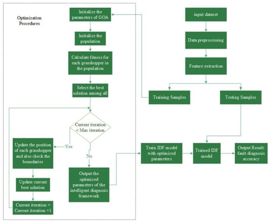 The study introduces an Intelligent Diagnosis Framework (IDF) optimized using the Grasshopper Optimization Algorithm (GOA), an advanced swarm intelligence method, to enhance the precision of bearing defect diagnosis in electrical machinery. This area is vital for the energy sector and IoT manufacturing, but the evolving designs of electric motors add complexity to fault identification. Machine learning offers potential solutions but faces challenges due to computational intensity and the need for fine-tuning hyperparameters. The optimized framework, named GOA-IDF, is rigorously tested using experimental bearing fault data from the CWRU database, focusing on the 12,000 drive end and fan end datasets. Compared to existing machine learning algorithms, GOA-IDF shows superior diagnostic capabilities, especially in processing high-frequency data that are susceptible to noise interference. This research confirms that GOA-IDF excels in accurately categorizing faults and operates with increased computational efficiency. This advancement is a significant contribution to fault diagnosis in electrical motors. It suggests that integrating intelligent frameworks with meta-heuristic optimization techniques can greatly improve the standards of health monitoring and maintenance in the electrical machinery domain.