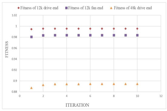 The pressure motor is put to the test, and the analog defect is detected with the help of an accelerometer attached to the motor’s driving end. The signal’s data are sampled at a rate of 12,000 per second. Figure 2 illustrates the experimental setup for rolling bearings. Acceleration data were collected from the motor bearings during testing using a 2 hp Reliance Electric motor. A two-horsepower Reliance Electric motor operates a shaft that holds a torque transducer and an encoder. To apply torque to the shaft, a dynamometer and an electronic control system are used. Bearings were contaminated with faults utilizing an electro-discharge machining (EDM) process. Inner raceway, ball, and outer raceway faults were inserted in a certain order, with fault dimensions ranging from 0.007 to 0.040 inches (0.18 to 0.71 mm). After replacing the faulty bearings in the test motor, vibration measurements were taken at loads from 0 to 3 horsepower (motor speeds of 1797 to 1720 RPM). A summary of the variation of parameters over the generation is shown in Table 2. Acceleration was observed on the base (BA), the fan end bearing, and the drive end bearing during each test. Four distinct groups of data are distinguished by their sample rate (12 or 48 kHz) and the position of the faulty bearing: 48,000 baseline, 12,000 drive end fault, 48,000 drive end fault, and 12,000 fan end fault.