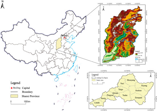 Jinzhong City is located in the central part of Shanxi Province, at latitude 111°25′ E–114°05′ E, 36°40′ N–38°06′ N. It is an important node of the central urban agglomeration in Shanxi and a national resource-based economic transformation and development demonstration area. As an important engine of the national energy revolution comprehensive reform pilot area, Jinzhong City is the main coal-producing area in Shanxi Province, belonging to China’s 14 billion tons of large coal bases and 9 million kilowatts of large coal power bases (Figure 1). By 2020, the coal resource reserve will reach 26.77 billion tons, which is typical of a mature coal resource city. However, the rapid economic growth of Jinzhong City highly relied on coal resources, and the large-scale mining of coal inevitably destroyed the local ecological environment. The contradiction between coal resource mining and the ecological environment has become the main contradiction faced by sustainable development, and it is urgent to carry out sustainable transformation and development.