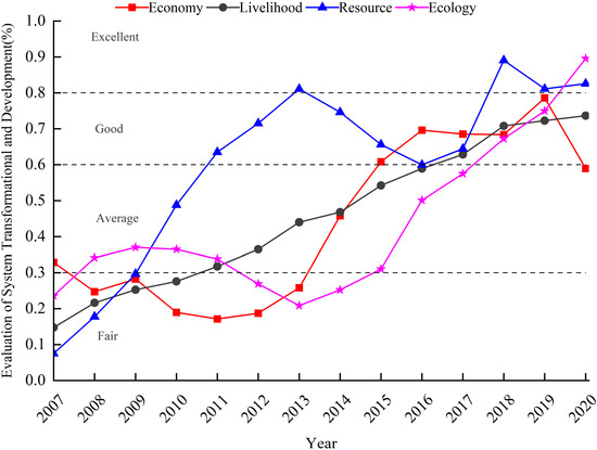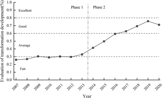 According to Formulas (1)–(8), the transformation and development performance of Jinzhong City from 2007 to 2020 is calculated (Figure 2). The “No. 38 Document” is the first guiding document for the sustainable development of resource-based cities in China. Jinzhong City has taken the pace of transformation with the “No. 38 Document”, and the industrial structure has gradually diversified. In the past 14 years, the transformation performance has increased from 0.260 to 0.711, and the trendline has climbed from the fair transformation stage to the good transformation stage. This is likely because economic development, people’s livelihood improvement, resource utilization, and the ecological environment have achieved great achievements. Among them, the improvement of people’s livelihoods is in a steady growth trend. Economic development, resource utilization, and the ecological environment show two stages of development, but they have also achieved great growth. Generally speaking, the transformational development of Jinzhong City presents two phases.