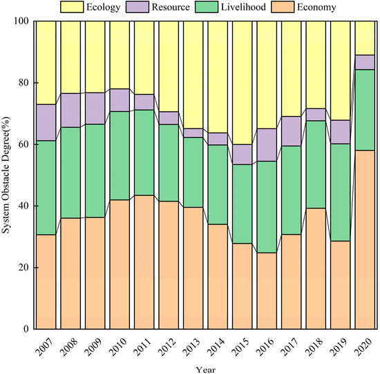 The obstacle degree model is used to diagnose the obstacle factors affecting the transformation and development performance of Jinzhong City (Figure 4). From Figure 4, it can be seen that the four systems of economic development, improvement of people’s livelihoods, resource utilization, and the ecological environment have different changes in the obstacle degree of Jinzhong City’s transformation performance. Generally, the obstacle degrees of the four systems show a large fluctuating trend. Among them, the obstacle degree of economic development is the largest, with an average of 36.6%. It shows an evolution trend of rising first, then falling and then rising, and then falling and then rising. Affected by COVID-19, it increased sharply to 58.1% in 2020, reaching the highest value. The obstacle degree of people’s livelihood improvement generally showed a “V”-type evolution trend from 2007 to 2020, with an average of 27.9%. The obstacle degree of resource utilization is the smallest, and it fluctuates between 4.0% and 12.0%, with an average of 7.1%. The average obstacle degree of the ecological environment is 28.4%. The trend of change in the obstacle degree of the ecological environment is opposite to that of the obstacle degree of economic development, showing a trend of decreasing first, then increasing, then decreasing, then increasing, and then decreasing. In 2020, the obstacle degree dropped sharply to 11.0%. Overall, economic development and the ecological environment are the main obstacle factors affecting the transformation and development of Jinzhong City. At the same time, it is necessary to take into account the obstacles to the improvement of people’s livelihoods and continue to optimize the use of resources.