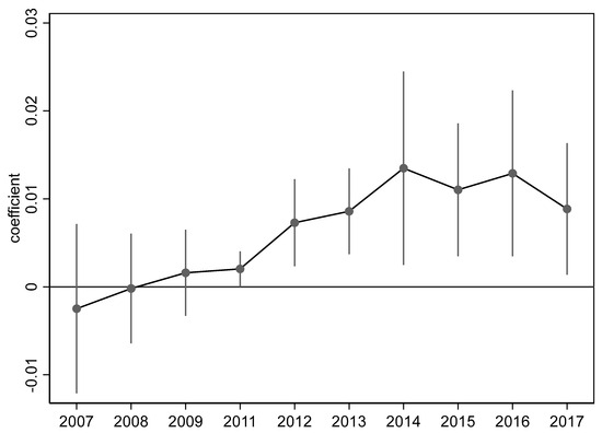 In Equation (2), is a year-by-year dummy variable, and the other variables are the same as those in Equation (1); if the coefficients are not significantly different before 2011 but significantly different after 2011, then the parallel trend assumption is satisfied.