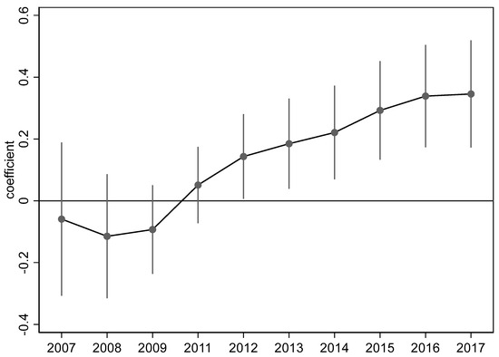 A key premise of using difference-in-difference analysis is that the trend over time between the experimental and control groups is consistent and not systematically different ex ante in the absence of shocks from the Strategic Emerging Industry Support Program. Therefore, we use the event study method to verify parallel trends by constructing the interaction term between the time dummy variable and the treatment group dummy variable from 2007 to 2017, as shown in Equation (2). To avoid complete multicollinearity, the year before the initiation of the Strategic Emerging Industry Support Program (2010) is used as a benchmark. If the coefficients of the interaction terms do not have significant differences before 2011 but have significant differences after 2011, the innovation levels of the experimental group and the control group have parallel trends before the promulgation of the policy and satisfy the premise of the difference-in-difference hypothesis.