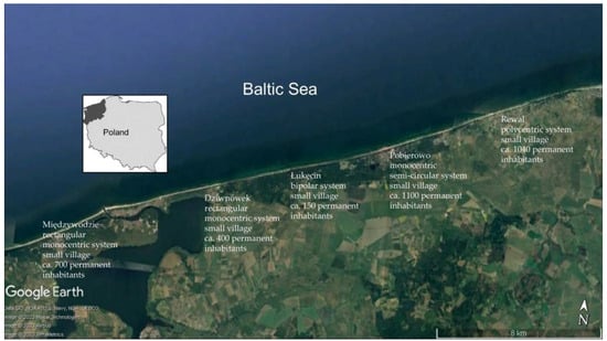 Small seaside spa villages in the West Pomerania region of Poland showing the spatial structure type (shown in Figure 2 below) and indicative number of inhabitants. Source: own picture drawn on Google Earth satellite image [5].