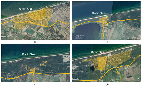 Spatial structures of selected seaside settlements in Poland: (a) monocentric semi-circular system of Pobierowo; (b) rectangular monocentric system of Dziwnówek; (c) bipolar system of Łukęcin; (d) polycentric system of Rewal. Source: own work against the background of a satellite image from Google Earth [5].