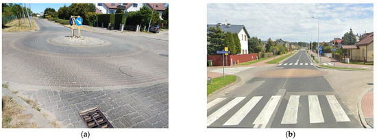 Raised junctions, mini roundabouts or traffic circles are often used in home or 30 km/h zones. The differences between roundabouts and traffic circles can be found in different publications [35,36]. However, they generally refer to older designs of these road components, covering larger surface areas [36]. However, in traffic calming areas, home zones in particular, there is a tendency to design traffic circles without reconstructing the approach legs, realigning of kerb-lines, etc. [37] to cut the project cost. Then, it is appropriate to refer to them with the term proposed in [38], i.e., “mini traffic calming circle”. Figure 3 shows some examples of such traffic circles that can be found in traffic calming areas in Poland. The traffic circle’s central island may be elevated above (Figure 3a) or installed flush with the surrounding road surface (Figure 3b). The central island may, but not necessarily, promote circular traffic. It may be imposed by appropriately used traffic signs and pavement markings. An example of a traffic circle with traffic signs imposing circular traffic around a raised central island is shown in Figure 3a. In Figure 3b, the traffic circle extends over the entire area between the kerb-lines, without imposing circular traffic as a result.