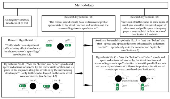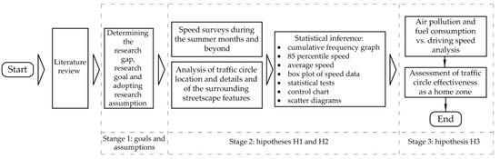 Section 2 of this article describes the object of study, which are seven traffic circles built about 20 years ago in a small seaside spa town in Poland, and the applied research methods. The study results are presented in Section 3. The results are discussed in Section 4 and the final conclusions of the study are given in Section 5. Figure 3 presents the stages of the study on traffic circle effectiveness as a traffic calming measure for home zone areas.