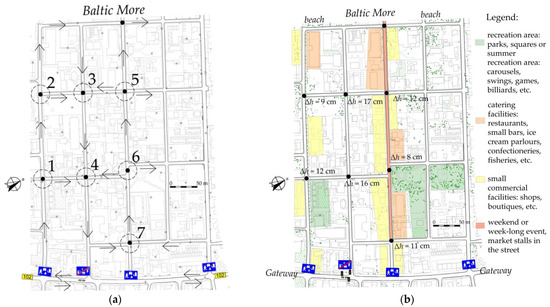 The locations of the seven analysed traffic circles are shown in Figure 6. This number includes two traffic circles located on Zwycięstwa St. (No. 1 and No. 2 in Figure 6). These junctions have three entry legs and one exit leg each. The remaining five traffic circles included three located on four-leg junctions (No. 3, No. 4 and No. 5 in Figure 6) and two located on staggered junctions on Wojska Polskiego St. (No. 6 and No. 7 in Figure 6). Traffic circles No. 5, No. 6 and 7 are located on Wojska Polskiego St., the promenade of Międzywodzie, lined with small restaurants, fishermen’s houses, ice cream parlours, pastry shops, small local markets, boutiques, etc. Various events take place during summer weekends along the whole of Wojska Polskiego St. between the DW102 provincial road and traffic circle No. 5. In summer too, further on to the north, a summer fair is held during which stalls are placed over the whole carriageway width. The northern part of Wojska Polskiego St. is blocked as a result. In turn, during the above-mentioned weekend events, stalls selling various merchandise are placed on the footpaths and on the carriageway. At all intersections, the side streets have 5 m wide carriageways, and have no footpaths running along the road or demarcated on-street parking spaces. Figure 5 shows as additional information the traffic directions on the analysed one-way streets and the height Δh of the raised central island.