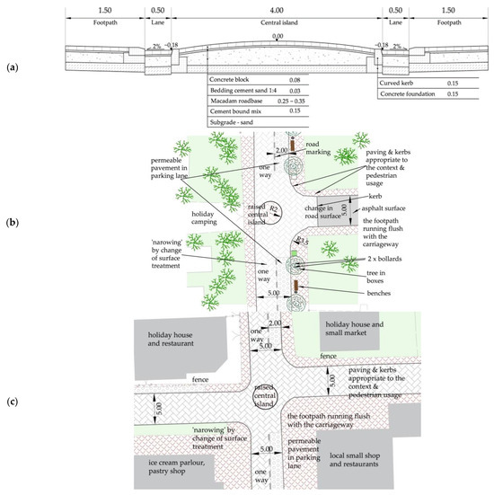 Streetscape and traffic calming measurements and visualisation of the analysed streets: (a) one-way street with parallel on-street parking on the right-hand side (Zwycięstwa St.); (b) one-way main promenade hosting various weekend events (Wojska Polskiego St.). Source: own drawings.