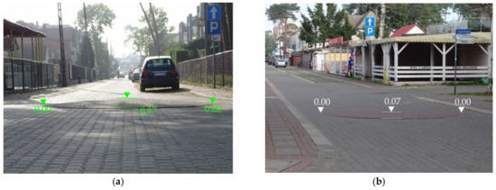Analysed traffic circles: (a) traffic circle No. 3—Δh = 0.17 m; (b) traffic circle No. 6—Δh = 0.08 m (all dimensions in metres). Source: photo by Alicja Sołowczuk.