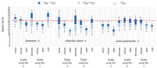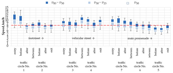 Firstly, the speed profile data reveal completely different traffic conditions at the times of the two surveys, i.e., in summer and in September (Figure 17). In the former case, with crowds of tourists walking on the footpath and on the carriageway, the traffic circles had some, though a rather small, slowing effect on the road traffic. Much higher speeds and a much more pronounced slowing effect of the traffic circles was noted in September when pedestrian traffic is limited to the guests at the health resorts and spas of Międzywodzie. The greatest speed reductions were recorded at traffic circles No. 3 and No. 4 located on Kasztanowa St. The speed reduction differences between these two are attributed to different longitudinal slopes on the junction approach sections. The next in order of speed reduction amount were the traffic circles located on Wojska Polskiego St. and Zwycięstwa St., with central island level difference of Δh = 0.11–0.12 m. Speed reductions of about 4 km/h were obtained on traffic circles No. 5 and No. 7, depending on the approach and departure speeds and the surrounding streetscape features. For example, in the case of traffic circle No. 5, there are local markets and boutiques at the main legs and the demarcated on-street parking spaces start as close as 3–4 m from the secondary leg kerb-line. These parking spaces are used by the spa house and are occupied also in autumn, prominently narrowing the travel lane. These are the main factors contributing to the obtained speed reductions. Traffic circle No. 7 is located 60 m from the home zone entry and this location defines the observed approach speeds. The home zone entry area and the junction corners are occupied by year-round open markets and public amenities, including post office, bank, pharmacy, etc., generating pedestrian traffic and frequent driving in and out of the parking spaces. The situation is different at traffic circles No. 1 and No. 2, with very few pedestrians or parked vehicles in autumn. This resulted in a smaller amount of speed reduction in autumn, in the order of 2 km/h.