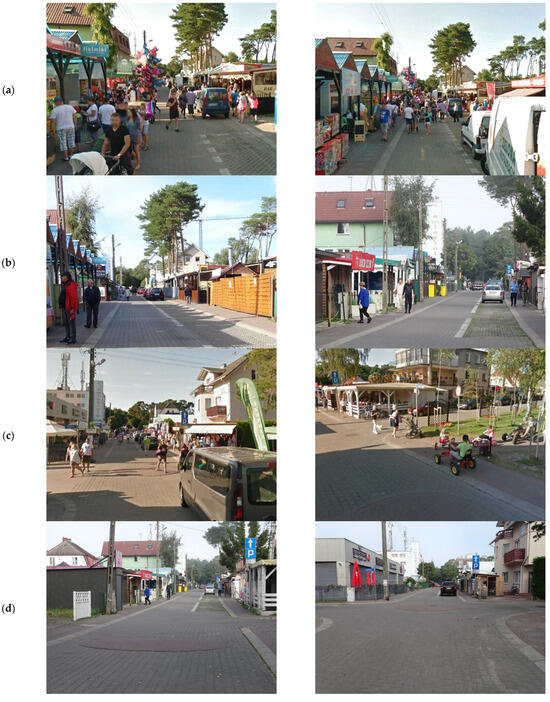 Differences in pedestrian traffic on the main promenade in the home zone area: (a) summer season—main promenade (Source: Google Earth [5]); (b) September—main promenade (Source: photo by Alicja Sołowczuk); (c) summer season—traffic circle No. 5 and No. 6 (Source: Google Earth [5]); (d) September—traffic circle No. 5 and No. 6 (Source: photo by Alicja Sołowczuk).