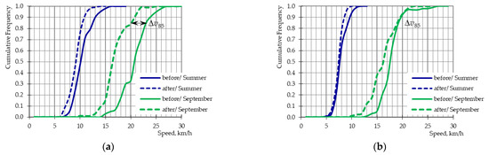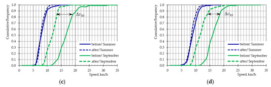 where: H0—null hypothesis, H1—alternative hypothesis, F(vbefore)—before speed cumulative distribution function, F(vafter)—after speed cumulative distribution function, λα—critical values, α—adopted significance level.