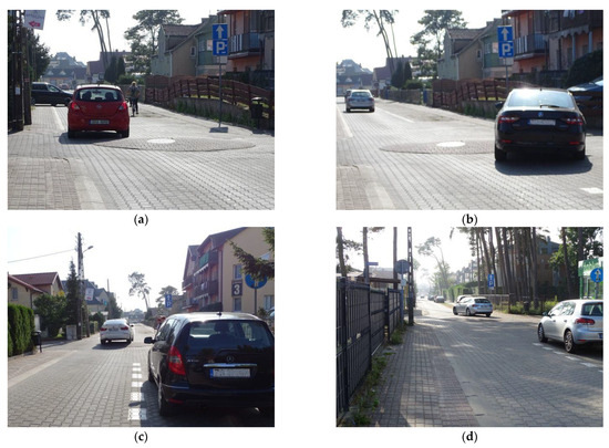 With a growing number of tourists in summer, this small spa town has had to deal with serious traffic-related issues. The main challenge was the high volume of pedestrian traffic on the way to and from the beach and a high demand for parking spaces there. Metered Parking Systems with designated and appropriately marked parking places are introduced in such places, similarly to those in home zones, to cope with these growing parking problems. In this situation, a home zone was implemented at the beginning of the 21st century in the central part of Międzywodzie (Figure 5). This involved two-way to one-way conversion of a few streets, constructing a few traffic circles, making the paved paths run flush with the carriageway surface, and demarcating of parking spaces. Improved traffic safety was another benefit of the implemented home zone. However, with no accidents recorded for the period 1995–2023 in the central road accident register SEWIK [39], we cannot give a poor traffic safety record as the grounds for home zone implementation. In fact, it was intended to cope with the parking problems and improve mobility amenities for tourists making their way through the main streets of this spa village.