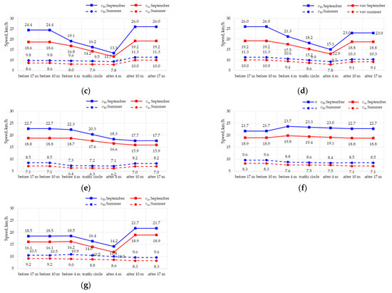 The results given in Figure 13 allow us to conclude that, even without summer visitors, traffic circles effectively slow down the traffic within junctions. In order to traverse the raised central island, the drivers reduce their driving speed by about 12–15 km/h. However, the slowing effect is limited to a max. 10 m distance. In summer, the speeds of travel on the sections between the junctions ranged from 7 to 10 km/h depending on the number of pedestrians and vehicles driving in and out of the parking spaces. In September, this range increased on the sections between the traffic circles to 20–25 km/h, the exact speed depending most probably on the number of parked vehicles.