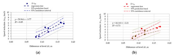Speed reduction vs. central island difference of level Δh: (a) v85; (b) vav. Source: own work.