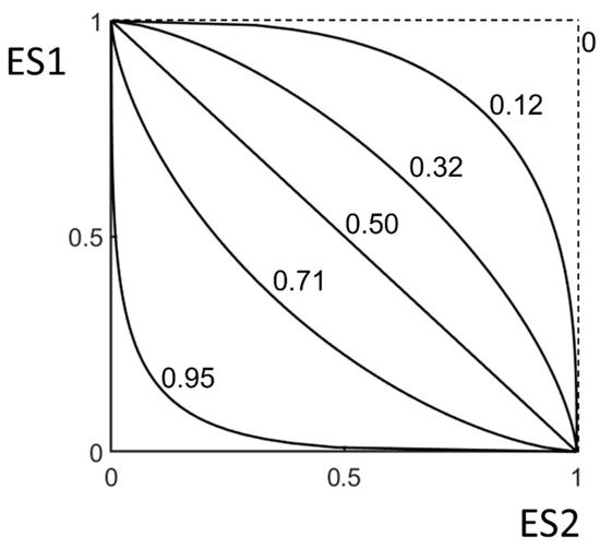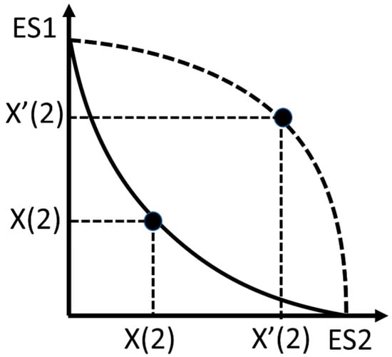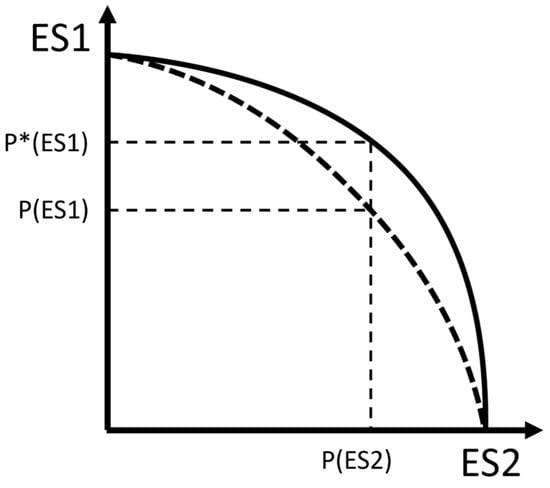 and denote the maximum of the range and the lower limit of the trade-off range for ES1, with corresponding notations for ES2. This is different from the initial mode of calculation in Equations (2)–(5) where the trade-off relationship was assumed to take place over the entire range (0; max) of the ES outcomes. Thus, Equations (2) and (3) are special cases of Equation (6).