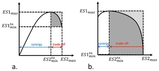 Examples of different relative ranges of synergetic and trade-off relationships between ES. (a) The synergetic relationship range is large compared to the trade-off range. (b) The synergetic relationship range is small compared to the trade-off range. The rectangular area encompassing the entire curve (0; ES1max) and (0; ES2max) is used to weigh TOS calculated within the range of the trade-off relationship (shaded and patterned) ; ES1max) and ; ES2max).