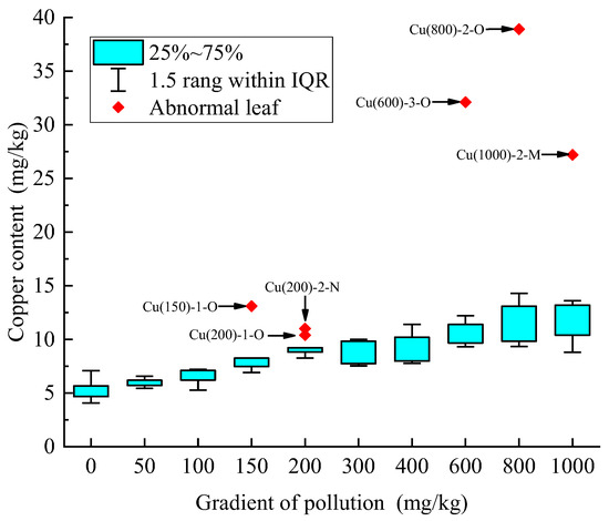 The copper content of corn leaves measured using ICP-OES under the same stress gradient should be in the same range, but there may be some outliers due to other uncontrollable factors such as the environment. The quartile method was used to calculate the range of copper content in the corn leaves for each stress gradient, and outliers were marked as shown in Figure 1.