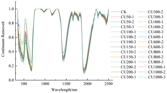 The CR and DRS spectral transformations were performed concurrently on the original spectral curves, and the results are shown in Figure 3 and Figure 4, respectively. The peaks and valleys of the curves were more visible after the CR transformation process, as shown in Figure 3. After the DRS transformation process, the spectral characteristics of the vegetation in the curves had disappeared, leaving only the characteristics of the copper elements visible, as shown in Figure 4.