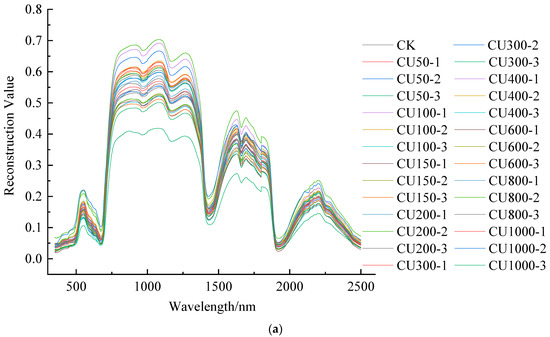 Figure 2 depicts the original spectral curves of the corn leaves with different gradients of copper stress. It can be seen from the figure that the spectral curves of all samples showed the spectral characteristics of typical vegetation. Due to varying degrees of copper stress, the spectral reflectance of the corn leaves exhibited distinct variations. In the vicinity of the chlorophyll absorption peaks at 450 nm and 650 nm, the spectral reflectance of the corn leaves increased with higher copper content, thus suggesting a reduction in chlorophyll content. Similarly, the reflectance near the green light reflection peak at 540 nm showed an upward trend with increased copper content, thereby indicating a decrease in the greenness of the corn leaves. In the spectral range of 780–1300 nm, which corresponded to the internal structure of corn leaves and was near the water absorption peaks of 1400 nm and 1900 nm, significant differences in reflectance were observed. These differences implied that copper affects the internal structure and water content of corn leaves, although no clear regularity was evident, thus making a direct prediction of the copper content challenging when using the original spectrum alone. Therefore, employing spectral transformation processing becomes necessary to enhance spectral characteristics and to capture the variations in the spectral curves of the corn leaves when under different copper stress gradients.