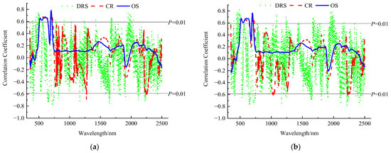 As shown in the figure, after the CR and DRS spectral transformation treatments, the correlation between the corresponding data of each band and copper content increased more clearly than in the OS, and the DRS increased more clearly than the CR. The number of bands passing the p = 0.01 significance test for the three types of data increased significantly after SVD treatment, as shown in Table 2 for the specific data comparison. The DRS transform has the highest number of bands passing the p = 0.01 significance test after the SVD treatment, as shown in the table, with 228 bands passing.