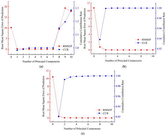 PLSR is a regression analysis of component variables that is obtained by combining principal component analysis and typical correlation analysis. It can analyze data with strong covariance, the containment of noise, and multiple independent variables. In order to obtain a relatively reliable regression analysis model, the number of principal components was integrated using the training set with a 9-fold cross-validation estimation of the root mean square error of prediction (RMSEP) and cumulative contribution rate (CCR) when building the partial least squares regression model. The current number of principal components is the optimal number of principal components when the RMSEP approaches 0 and tends to be stable, as well as when the CCR reaches 0.99 and tends to be stable. The construction of the PLSR model in this study was conducted in MATLAB (version R2023b).