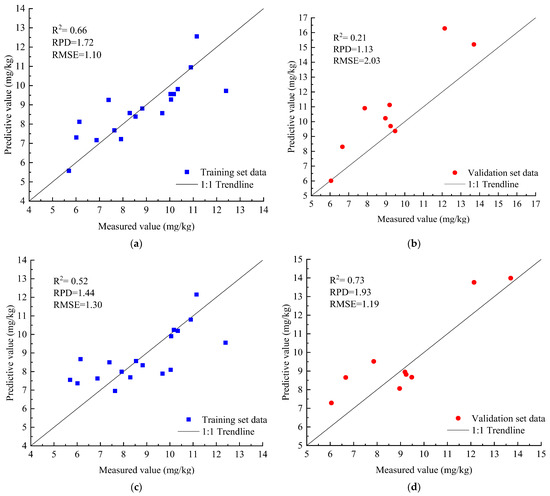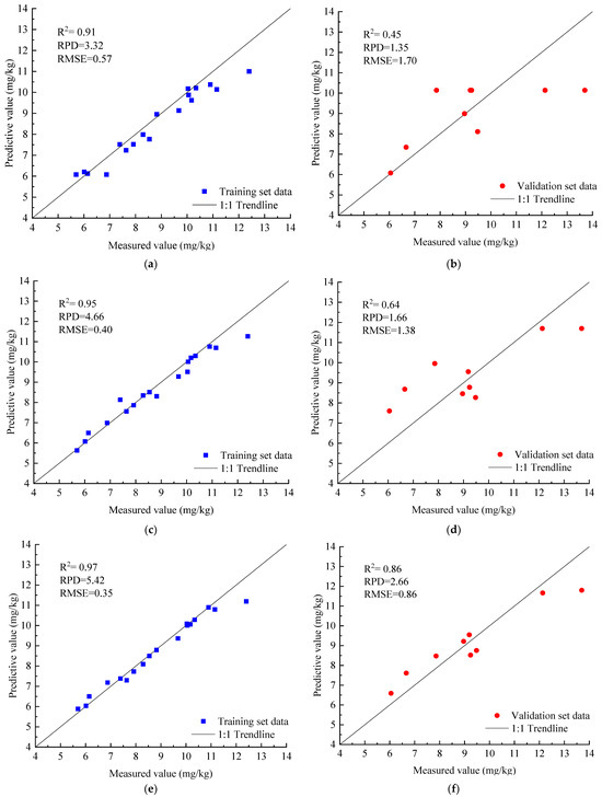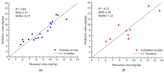 The PLSR prediction model was created according to the chosen master fraction, and the scatter plot of the prediction model effect and accuracy assessment is shown in Figure 8. Figure 8a,b show that the R2 in the training and validation sets of the OS-based prediction model was low, the RMSE was large, and the RPD was less than 1.4, which indicates that the prediction ability of the OS-based prediction model was poor. Figure 8c,d show that the validation set of the prediction model that was established based on CR had a high accuracy, with an R2 of 0.73, an RMSE of 1.19 mg/kg, and an RPD of 1.93. However, the accuracy of the model established by the training set samples was low, and the large gap between the accuracy of the model established by the training set and the validation set samples indicated that the stability of the model was not high. In addition, the RPD was less than 2, thereby indicating a general predictive ability of the model. Figure 8e,f show that the R2 of the DRS prediction model’s training and validation sets was greater than 0.7, the RMSE was small, and the RPD of the training set samples was 2.51, thus indicating that the DRS prediction model has a strong prediction ability and high stability. Overall, the OS-based PLSR prediction model had the lowest predictive power, and it produced the least reliable prediction results. The PLSR prediction model based on CR had a good general prediction ability and achieved better prediction results than OS, but the model’s stability was poor. The PLSR prediction model that is based on DRS outperformed the OS and CR in terms of predictive power and stability.