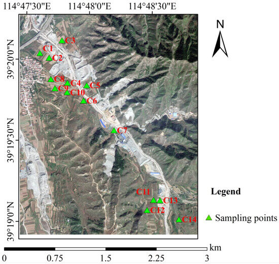 The visible–near infrared spectral data of the field-grown corn leaves near a mining area in Baoding, Hebei Province, China, were chosen for analysis in order to test the robustness of the two models. In September 2021, fourteen sets of corn leaf samples were collected from different locations near the mining area, and the distribution map of the sampling points is shown in Figure 10.