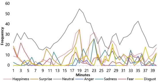 We employed a machine-learning-based facial expression recognition software called Facereader to capture facial image of students engaged in interactions every 5 s throughout a 40 min classroom learning session. In this way, we collected a total of 2851 facial expression information points. For instances where students’ faces were blurred or obscured, preventing accurate emotion identification, these cases were marked as unknown emotions to ensure the integrity of the data analysis. The results of student interaction emotions analysis are presented in Table 3. In addition, to investigate the temporal patterns of various emotional changes among students in the classroom, we conducted a detailed analysis of the identified emotions using temporal statistics. The temporal changes in different emotions among students are illustrated in Figure 3. As depicted in the figure, the horizontal axis denotes the 40 min duration of the classroom teaching process, while the vertical axis signifies the frequency of each emotion type that emerges within that minute. Each emotion category is represented by a distinct color.