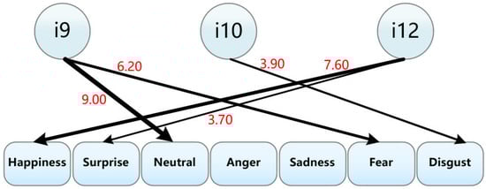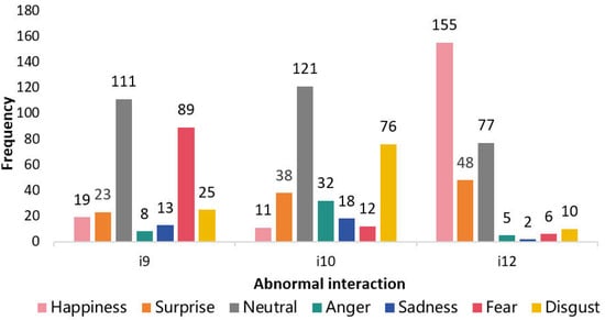 In order to further explore the intricate relationship between students’ abnormal interactions and emotions, we used the chi-square test to analyze the results, which are shown in Table 4. The chi-square values marked with an asterisk indicate that there is a significant correlation. By statistically analyzing the results, we found a significant correlation between students’ abnormal interactions and some emotions. Students’ talk nonresponse (i9) was strongly correlated with neutral and fear emotions, and students’ disobeying instructions behavior (i10) was significantly correlated with disgust emotions. Students’ talking without permission (i12) was also significantly correlated with the emotions of happy and surprised.