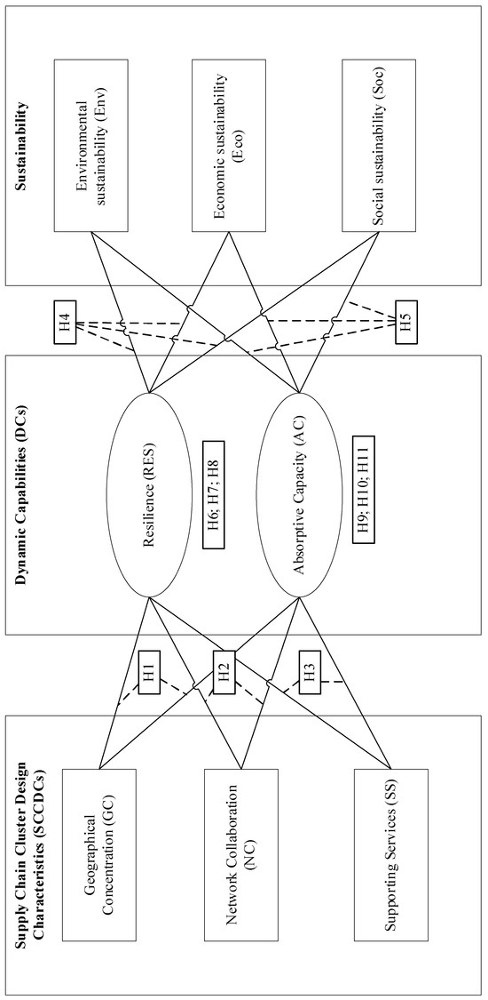 Since collaborative efforts of all stakeholders facilitate sustainability development [4,54], it can be argued that SCCDCs facilitate sustainability improvements, especially since they help in cost reduction and enhancing productivity with the lowest waste [55] and cost possible through cost and resource sharing [56]. However, internal capabilities need to be developed so that organisations will be able to acquire and use external resources to create a competitive edge. In this sense, SCCDCs can be used by organisations (subsystems) to collaborate and benefit from the knowledge and resources located in SCC (system), in an effort to enhance their capabilities [29]. In other words, it can be argued that organisations’ DCs can be enhanced through collaboration and integration in a SCC. Then, using their internal enhanced capabilities, resilience and AC, organisations can develop their resources by using available external knowledge and resources to enhance their sustainability levels. Thus, it can be hypothesised: