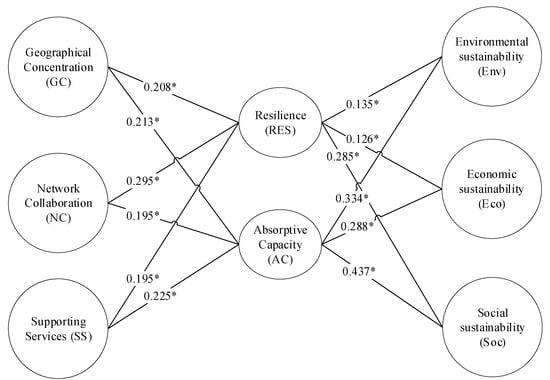 Results of direct effect. Source: this study. Notes: * indicates significance at the 5% level. GC = Geographical Concentration; NC = Networked Collaboration; SS = Supporting Services; RES = Resilience, AC = Absorptive Capacity; Env = Environmental Sustainability; Eco = Economic Sustainability; Soc = Social Sustainability.