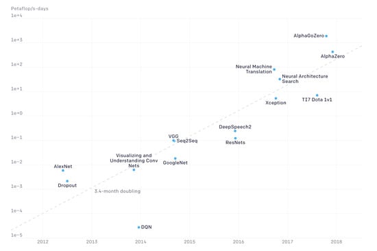 Visualization of the escalating computational needs from AlexNet in 2013 to AlphaGo Zero: the data points, when fit exponentially, indicated a doubling time of 3.4 months, as sourced from OpenAI [].