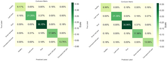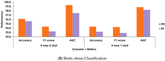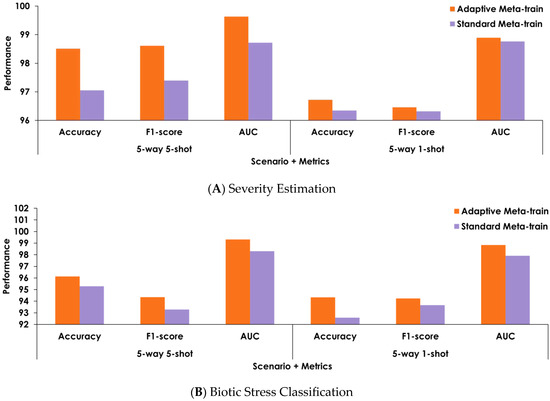 Figure 8 displays the comprehensive ablation analysis that thoroughly assesses the performance of our model when implemented with the proposed adaptive meta-training, and when implemented with the standard meta-training approach. As shown, the experimental results show that adaptive meta-training reveals a noteworthy advantage and demonstrates superior adaptability to developing task distributions and complexities. With the dynamic adjustment ability of our meta-learner, our approach excels in capturing task-specific nuances, thus showcasing higher accuracy and robustness in multi-task leaf diagnosis. On the other hand, with the conventional meta-training approach, our model suffers from limited adaptability in the face of changing circumstances.