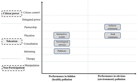 As we can see from Figure 3, the involvement in the environment eventually reaches the primary degree of citizen power. In the case of health, the engagement of residents is realized through community survey propaganda and posting announcements, which still represents a degree of tokenism. Therefore, in conjunction with Section 3, we can conclude that residents’ participation in the obvious pollution outstrips participation in hidden pollution, showing a ladder shape.