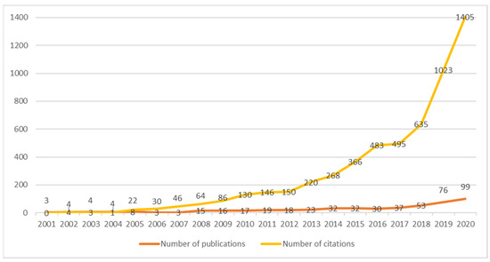 The evolution of the central theme of this document from 2001 to 2020 can be observed in Figure 1. The article titled “The consequences of tourism for sustainable water use on a tropical island: Zanzibar, Tanzania” [28] was the first published in the current century related to the topic of sustainable development. Furthermore, this publication was also the first to be cited in the year 2002, the year following its publication. Currently, it holds the 15th position among the most cited documents, as will be analyzed in the following section. From 2001 to 2008, the annual publications numbered only in single digits, and yearly citations did not exceed 50. The year 2005 stands out with an atypical number of publications according to the trend, attributed to two journal issues. The first was the second issue of volume 26 of the Tourism Management journal, which included two articles. The second was the Journal of Cleaner Production, volume 13, with a special issue on sustainable tourism, incorporating four documents addressing sustainable development. From 2008 to 2013, there is evidence of growth in publications, reaching 10 publications per year, surpassing this number to slightly over 20, while citations, following this increasing trend, exceeded 200 annually. From 2014 to 2017, the average number of annual publications increased to 32, and citations showed significant growth, rising from 268 to just under 500 per year.