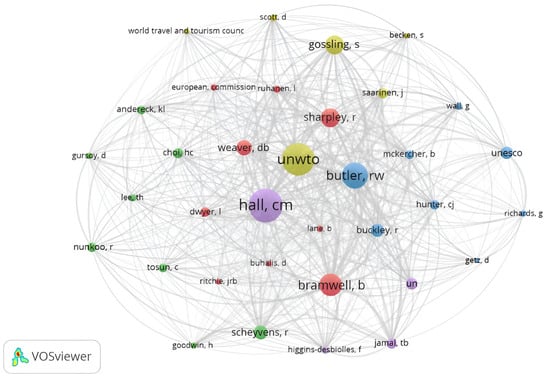 Both in Table 3 and Figure 2, Colin M. Hall is observed as the most co-cited author, linked with 498 other authors among those who published the 496 documents in this analysis. The World Tourism Organization (UNWTO) is the second-largest source of co-citations with 493. Butler, R.W. and Bramwell, B. continue the list with 489 and 441 co-citations, respectively. Stefan Gossling holds a special mention as the fifth author in co-citations with 413, and according to Table 3, he is the third most cited overall. Finally, J. Saarinen does not hold a prominent position in the graph; however, he ranks 13th in co-citations and, as previously mentioned, is the most cited author. In general, it can be asserted that the two most important authors, considering their contributions and the behavior of the analyzed indicators, are Colin Michael Hall and Jarkko Saarinen.