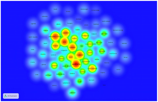 According to what is depicted in Figure 3, the country with the highest number of citations, highlighted at the center of the red circle, is Australia with 1525 citations, followed by China with 1154, the USA with 1132, England with 1017, and Canada with 949. In the sixth place is Sweden with 865, followed by Finland with 726 in the seventh place, New Zealand with 662 in the eighth place, Spain with 653 in the ninth place, and Turkey in the tenth position with 469 citations.