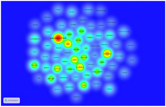 In the International Tourism Highlights report [45], the section “World’s Top Destination” displays the countries that receive and send the most tourists globally. Among them, notable mentions include France, Spain, USA, China, Italy, Turkey, Mexico, Thailand, Germany, UK, Canada, Russia, Australia, the United Arab Emirates, and Korea. Upon revisiting Figure 3 and Figure 4 and reflecting on the key countries generating studies, it becomes evident that some of those mentioned earlier are among the highest contributors to research and citations. In other words, they coincide not only as major hubs for tourist activity and economic impact but also in terms of specific research on this subject. This group includes Spain, USA, China, Turkey, England, Canada, UAE, and Australia.