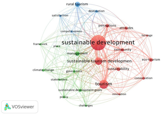 The overarching theme subjected to comprehensive analysis is sustainable development in tourism. In this context, a focus on sustainable tourism development predominates. As an intermediate theme, management related to sustainable tourism activity stands out, while rural tourism as a type and geographical location of sustainable tourism activity is of lesser prominence. This can be observed in Figure 5. Consequently, the map shown in the mentioned figure breaks down these topics into three clusters, which are described below in terms of their composition and content.