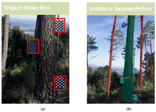 The present work uses the latest instance segmentation methods to identify and delimit a tree trunk in an image to calculate the volume of the tree. Figure 1 shows examples of object detection and segmentation. The first image only represents the detection of objects; in this case, chessboard patterns are detected and framed. The second image shows instance segmentation, where tree trunks are detected and properly marked out of the background.