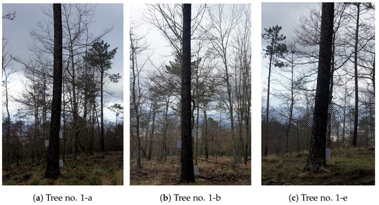 Examples of images taken of the same tree: 1-a—longest distance; 1-b—shortest distance and taken in front of the tree; 1-e—with an inclination towards the tree and the targets.