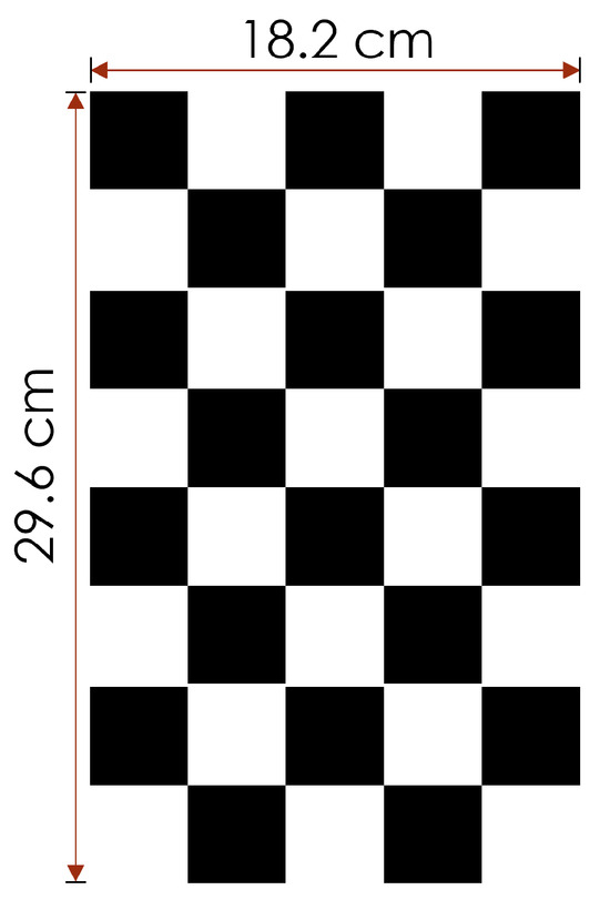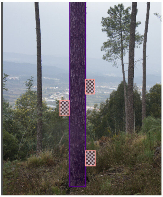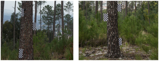 The design of the targets followed a checkerboard-like pattern typically used in computer vision algorithms, as shown in Figure 5. Each target had the dimensions of 29.6 cm × 18.2 cm. The model was trained with a dataset containing images of maritime pine trees with three targets placed on the trunk. The targets were used as reference scales to calculate the trees’ dimensions.