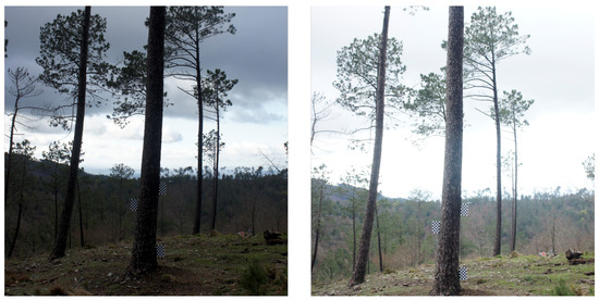 When creating the dataset, several measurements were taken to maximise the model’s tolerance to the environmental conditions. Different trees were photographed at other times of the day to increase the diversity of lighting conditions in the dataset. The photographs were taken from 5, 10, and 20 m away, depending on the tree’s height. Initially, 137 images were used to begin the training phase. Still, it was quickly observed that there were several characteristics of the images that produced poor results in that phase, namely the distance at which the tree was photographed, the inclination of the targets, the overlapping of trees behind the photographed tree that was confused with the tree under analysis, and the amount of light. These problems imposed a very rigorous selection of images in that training phase, which led to working with a total of 48 images that had the necessary characteristics to carry out this first work. Figure 3 shows examples of images of the same pine tree from the dataset but in different positions and lighting conditions.