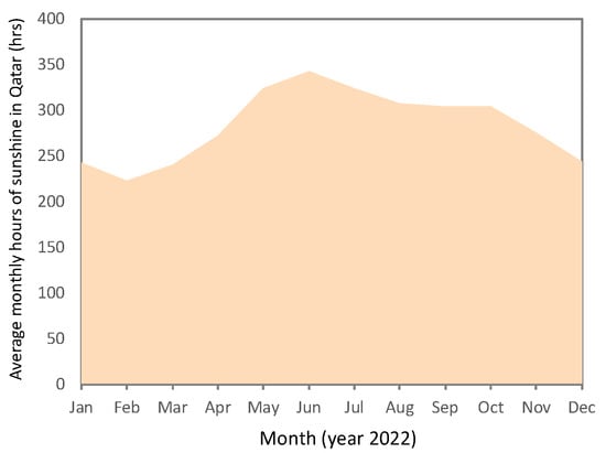 - Average Monthly Hours of Sunshine in Doha, Qatar. World Weather & Climate Information. Available online: https://weather-and-climate.com:80/average-monthly-hours-Sunshine,doha,Qatar (accessed on 24 October 2023).