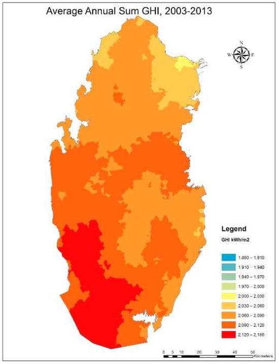 - Bachour, D.; Perez-Astudillo, D. Ground-measurement GHI Map for Qatar. Energy Procedia 2014, 49, 2297–2302. [Google Scholar] [CrossRef][Green Version]