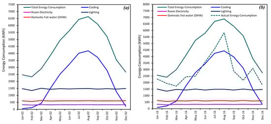 The simulated energy consumption patterns for 2016 follow similar monthly trends observed in 2002, with cooling electricity peaking in August. However, total cooling demand is higher, with increases of ~6% in summer months (May–August) and more substantial average rises of ~56% in winter months (December–March) compared to the 2002 baseline. The more pronounced winter demand escalation implies climate change could disproportionately impact cooler periods in Qatar and the wider Persian Gulf region. Whereas summers have always driven peak air conditioning loads, the modelling indicates winters could also see dramatic intensification of cooling usage as minimal temperature thresholds for operating AC systems are crossed more frequently with climate change [68]. The close alignment between simulated and measured electricity use for 2016, as illustrated in Figure 6b, verifies the validity of the DesignBuilder modelling approach.
